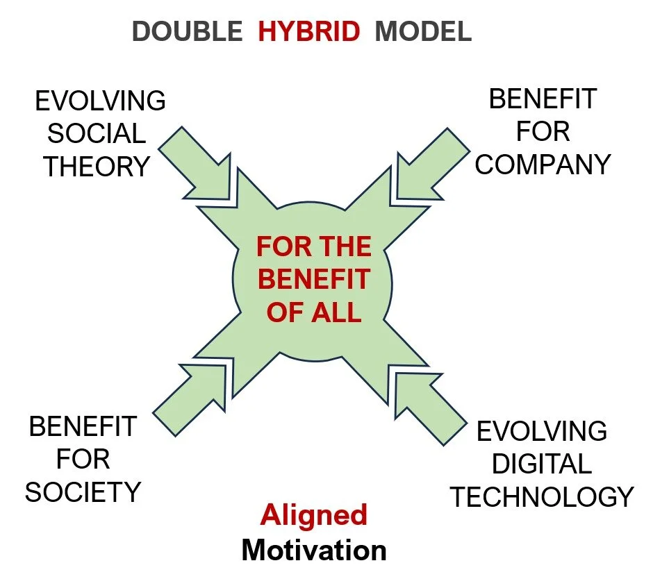 Enlightened self-interest makes it possible to accelerate change for the good of all. It can also bring the stakeholders in society to aligned motivation as we describe in our “Double Hybrid Model” illustration.
